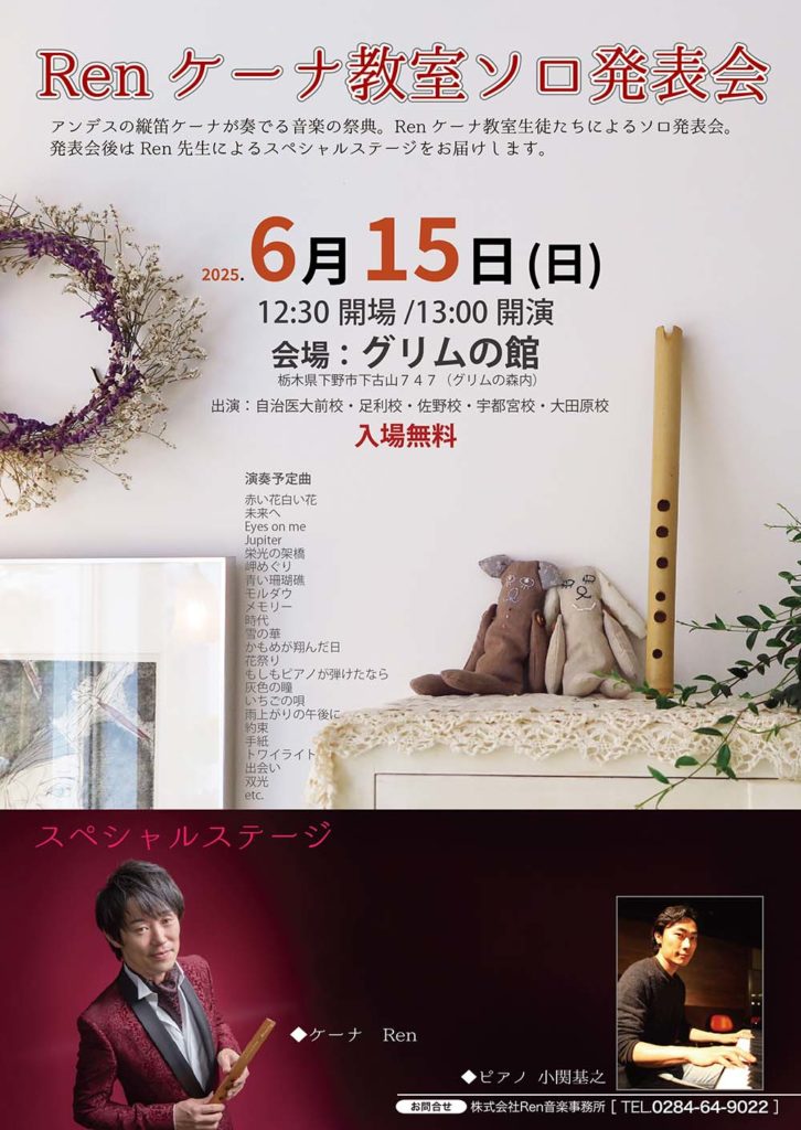 2025過去のスケジュール2025年7月5日6/15 ㈰栃木県下野市:Renケーナ教室ソロ発表会 Ren official 保存する共有:会場:グリムの館 下野市下古山747入場無料時間:12:30開場 13:00開演グリムの森駐車場とは別に臨時駐車場を設けます。古山小学校(職員駐車場)が利用できます。